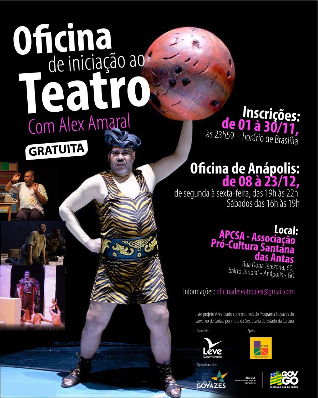 A APCSA – Associação Pró-Cultura Santana das Antas recebe em Anápolis a Oficina de Iniciação ao Teatro, conduzida pelo ator, diretor e professor Alex Amaral. O programa promove uma imersão prática e teórica de três semanas, voltada ao estudo da linguagem teatral, e culmina com uma mostra aberta ao público, apresentando os trabalhos desenvolvidos pelos participantes. Link para inscrição: Aqui