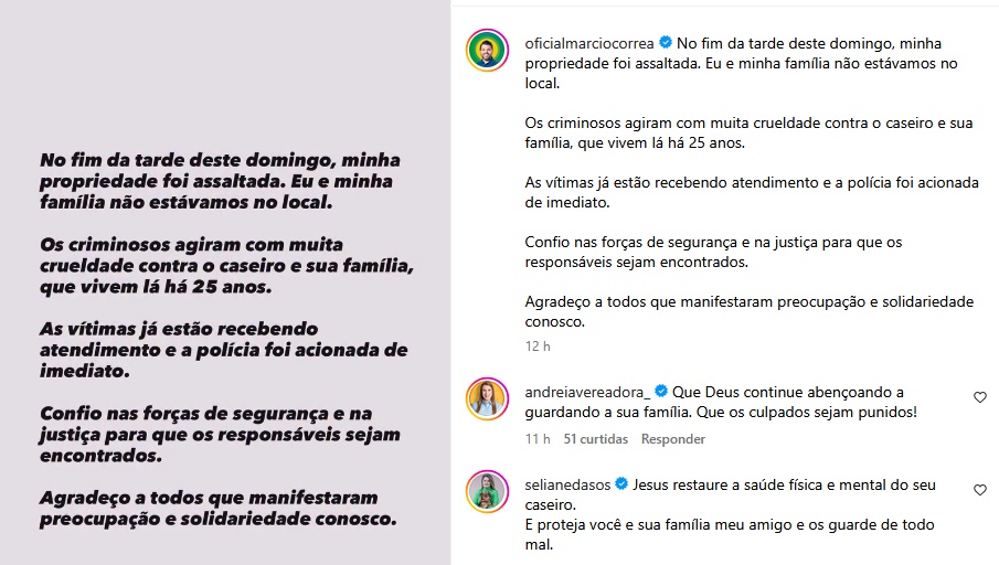 “Agradeço a todos que manifestaram preocupação e solidariedade conosco”, ressaltou Márcio Corrêa na sua publicação.