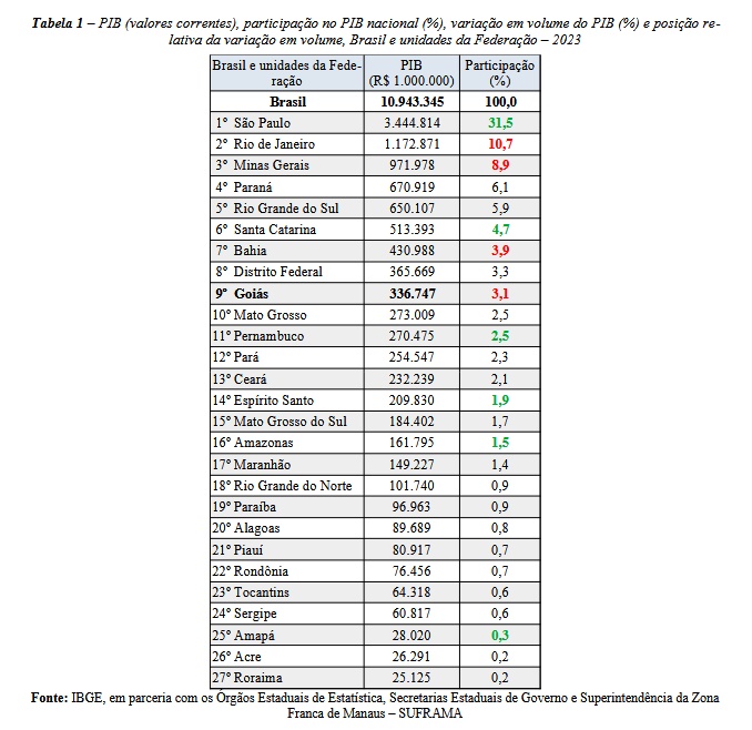 Goiás manteve o nono lugar no ranking, com participação de 3,1%. O volume do PIB goiano, em 2023, foi de aproximadamente R$ 336,7 bilhões.