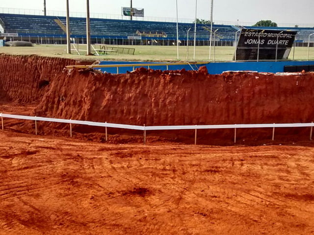 A GM Engenharia, Construções e Comércio Ltda. paralisou as obras de construção da nova arquibancada do Estádio “Jonas Duarte”, retirou os operários e, também, todas as máquinas que trabalhavam no local. Segundo a assessoria da empresa, o motivo é em atendendo a um pedido do Prefeito Municipal, João Gomes, e do Secretario de Obras, Leonardo Vieira, que estão estudando a possibilidade de rebaixar o gramado do Estádio antes da construção da nova arquibancada. A própria construtora advertiu às autoridades da necessidade desta obra que seria a 4ª etapa do projeto, alegando que se ela for feita depois da construção da arquibancada, ela se tornaria inviável, por não haver espaço para a entrada e a saída de caminhões para a retirada da terra do local. Mas, o secretário de Esportes, Ademir Marinho, não entende assim e acredita ser possível o rebaixamento do gramado só após a conclusão das boras da arquibancada, do novo sistema de Iluminação e da reforma do setor de cadeiras e cabines de imprensa.