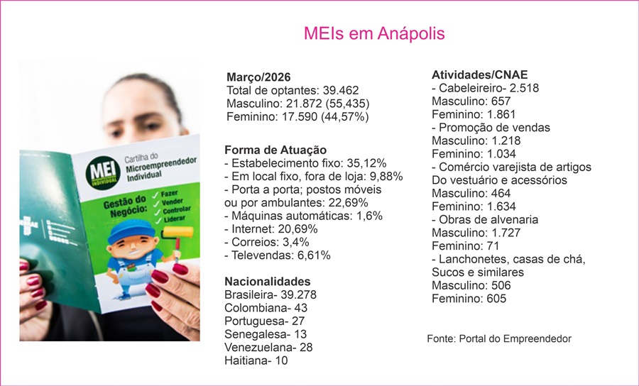 Mas, tem-se ainda 43 MEIs em Anápolis de nacionalidade colombiana; 28 de venezuelana; 27 portuguesa; 13 senegalesa e 10 haitiana. No total, o cadastro registra pessoas optantes de ambos os sexos de 34 diferentes nacionalidades.