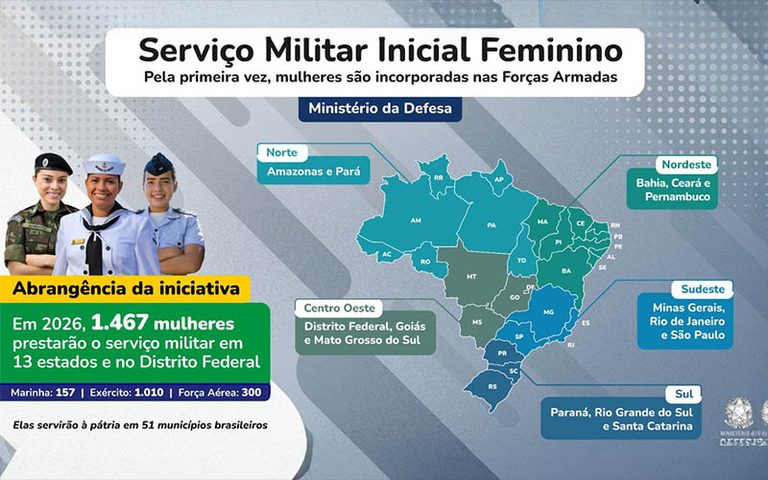 Em todo o país, serão incorporadas 1.467 mulheres, que prestarão o serviço militar em 13 estados e no Distrito Federal, distribuídos em 51 municípios brasileiros.