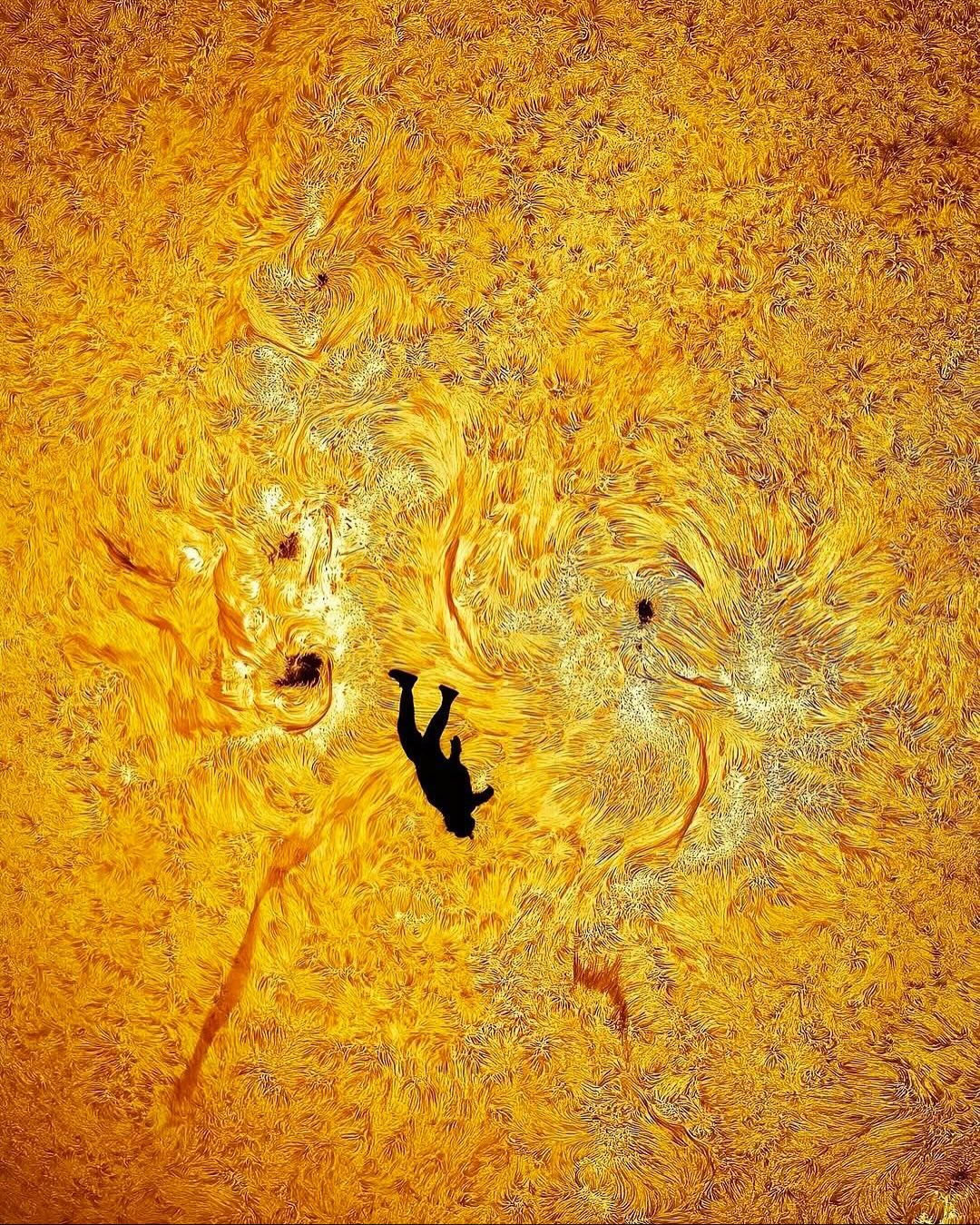 Um dos registros mais surpreendentes da astrofotografia moderna ganhou destaque nas redes sociais. O norte-americano Andrew McCarthy (@cosmic_background) capturou o instante exato em que o paraquedista, youtuber e músico Gabriel Brown (@blackgryph0n) surge alinhado com o disco solar durante uma queda livre a mais de mil metros de altitude. O resultado, batizado de “A Queda de Ícaro”, mostra a silhueta do atleta aparentemente cruzando a superfície do Sol, em um contraste tão preciso quanto impressionante.