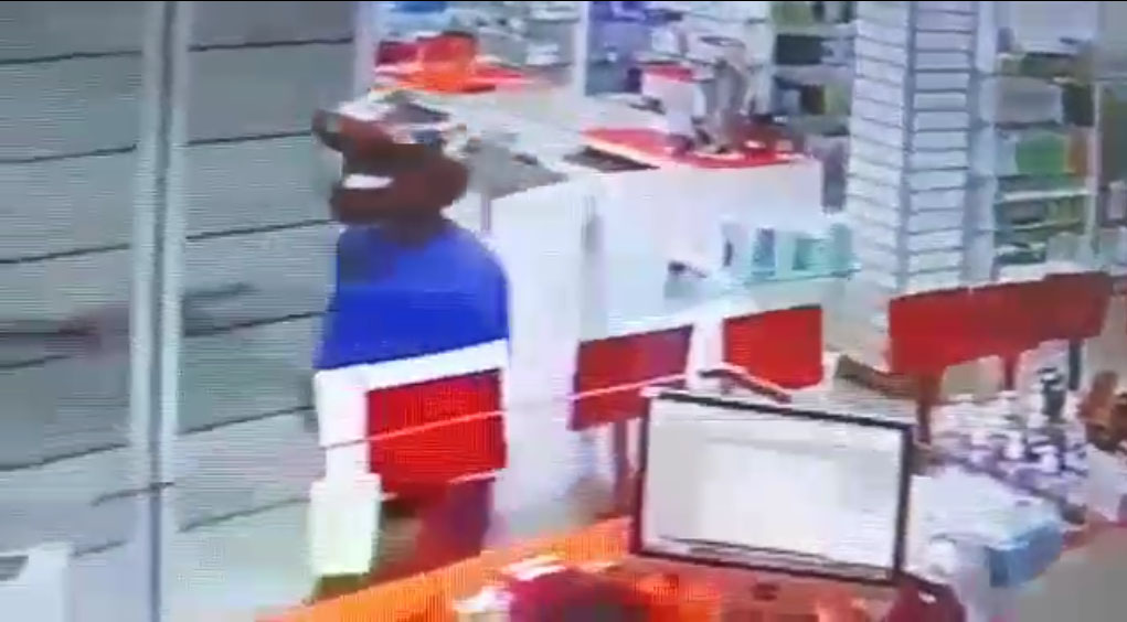 Um homem entrou na farmácia e pediu uma dipirona ao atendente. Logo em seguida, ele saca a arma e anuncia o assalto. Câmeras de segurança do estabelecimento flagraram a ação do criminoso.